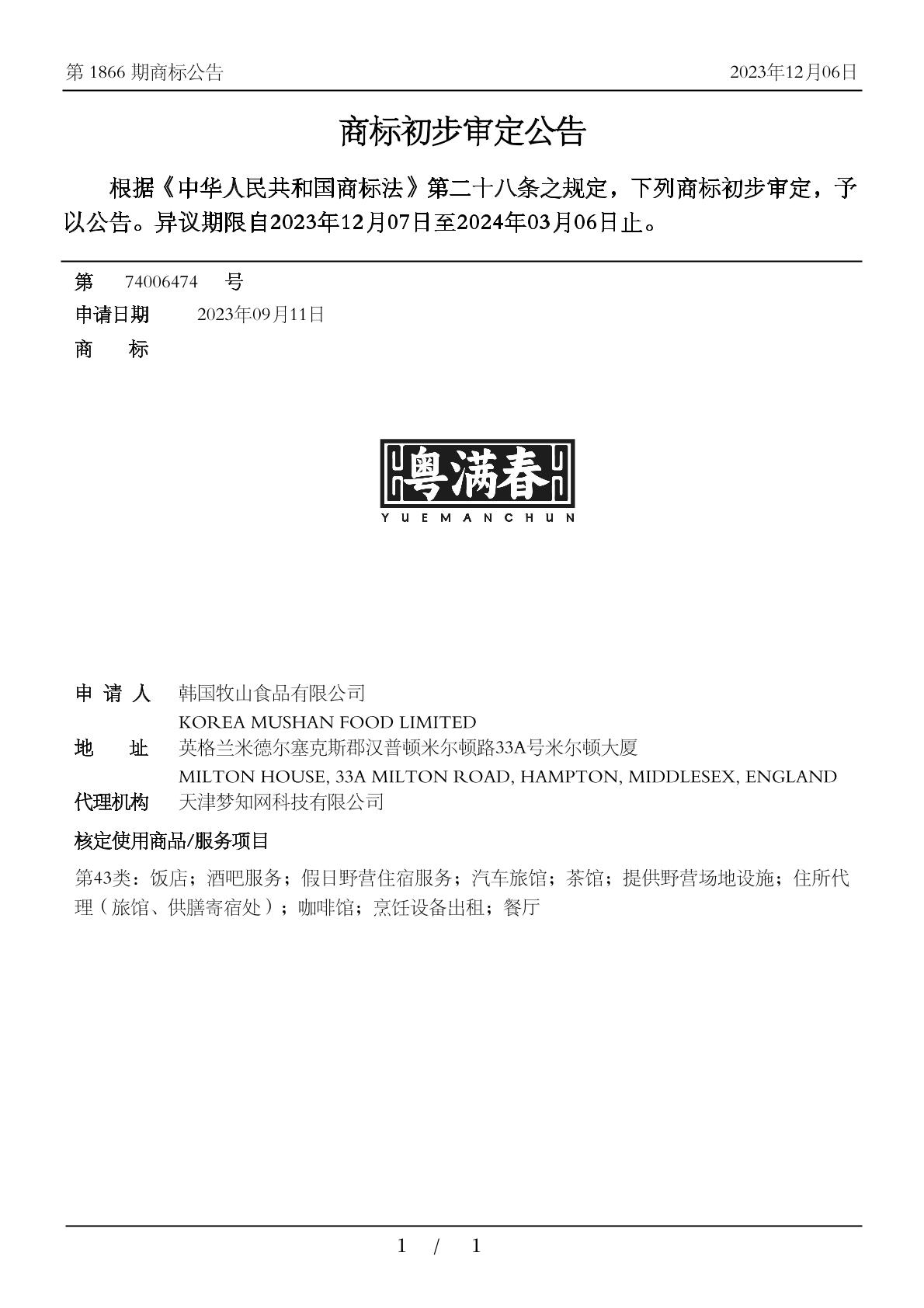 商标分类:43类 餐饮住宿